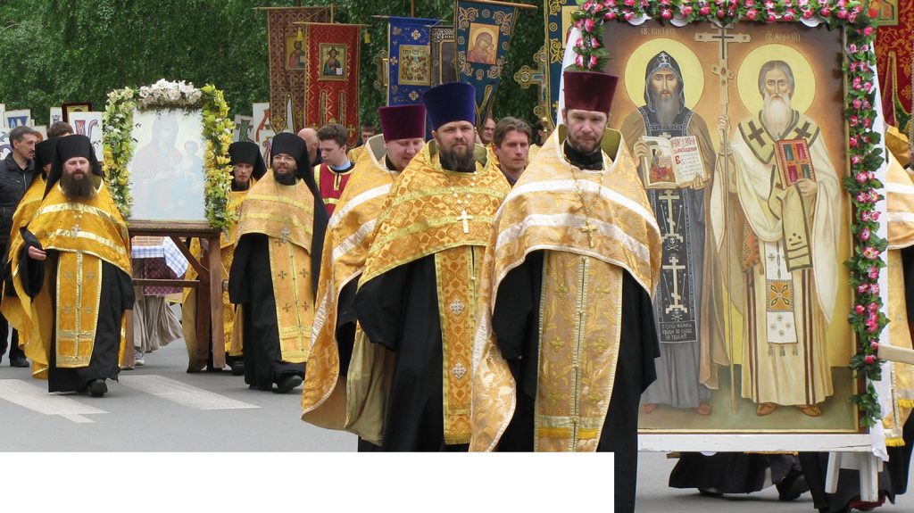 St Methodius (who alongside his brother Cyril brought the Christian faith into central and eastern Europe) died today in 885. As part of their missionary work, they created an alphabet to translate the Gospels and church prayers into the language of the Slavs, which eventually became the Cyrillic alphabet, still used in Russia, Serbia, Bulgaria and the Ukraine. Methodius, along with Cyril and Benedict of Nursia, is one of the three patron saints of Europe. Icons of both saints are seen above in an Orthodox procession.